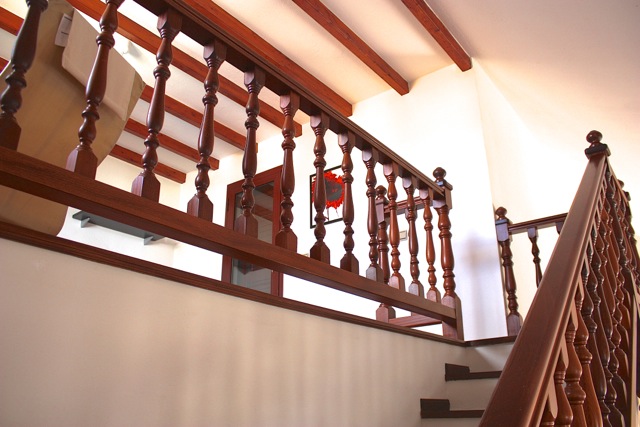 Ebenfalls vom Wohnzimmer aus führt eine schöne Holz-Treppe hoch in zweite Geschoss. Hier befindet sich noch ein Lesezimmer unter dem Dach, das hinaus zu einer kleinen Dach-Terasse mit tollem Fernblick führt.